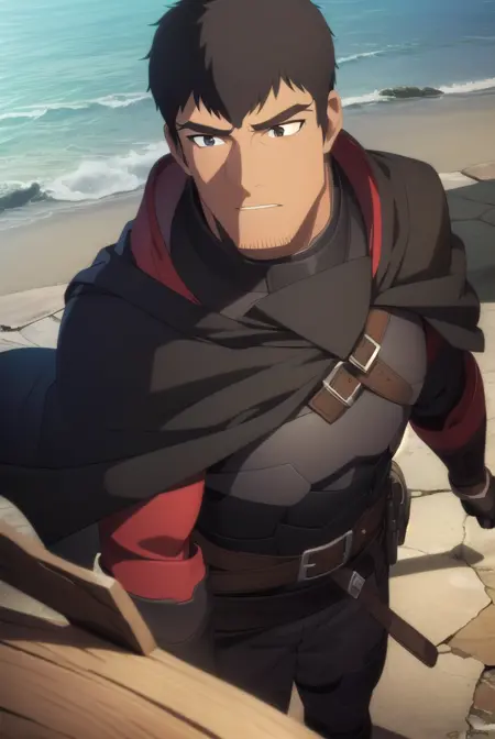 davion, short hair, black hair, 1boy, facial hair, thick eyebrows, muscular male, bara, sideburns, mature male, stubble, muscular, (black eyes:1.5),