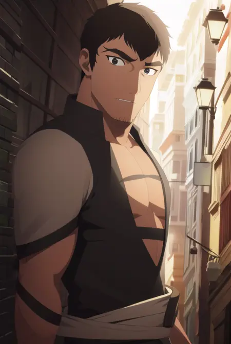 nipples, nude, dark skin, stomach, muscular, scar, abs, pectorals, scar on face, large pectorals, scar on chest, scar on shoulder, scar on arms,