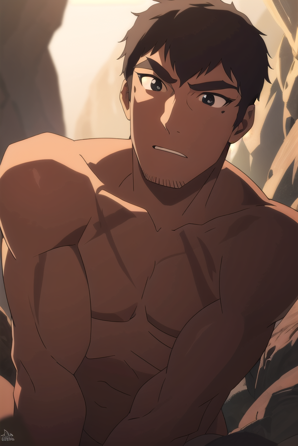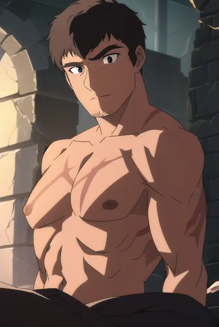 nipples, nude, dark skin, stomach, muscular, scar, abs, pectorals, scar on face, large pectorals, scar on chest, scar on shoulder, scar on arms,