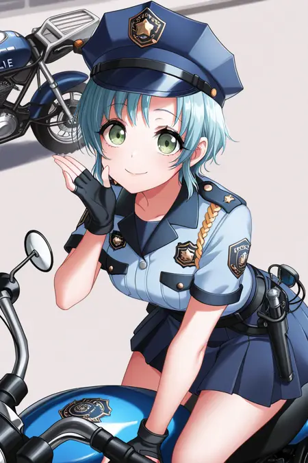 towa, 1girl, solo, skirt, school uniform, short hair, green eyes, white sleeves, blue skirt, smile, pleated skirt, purple bow, hand on hip