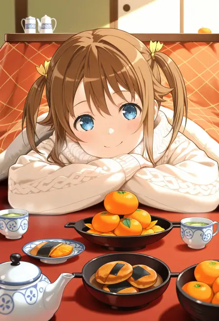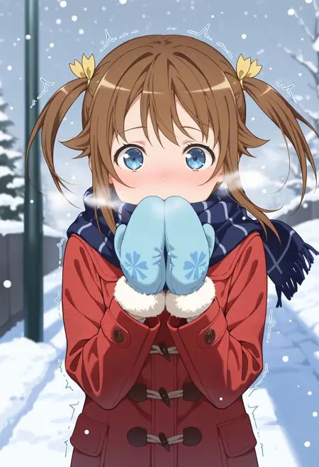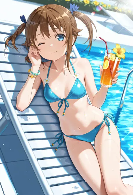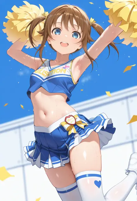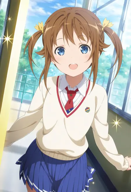 Trigger: misakiakeno,1girl brown hair, blue eyes, twintails, , school uniform, serafuku, pleated skirt, short sleeves, blue skirt, red neckerchief, short hair, white shirt, hair ribbon, yellow ribbon, white sailor collar