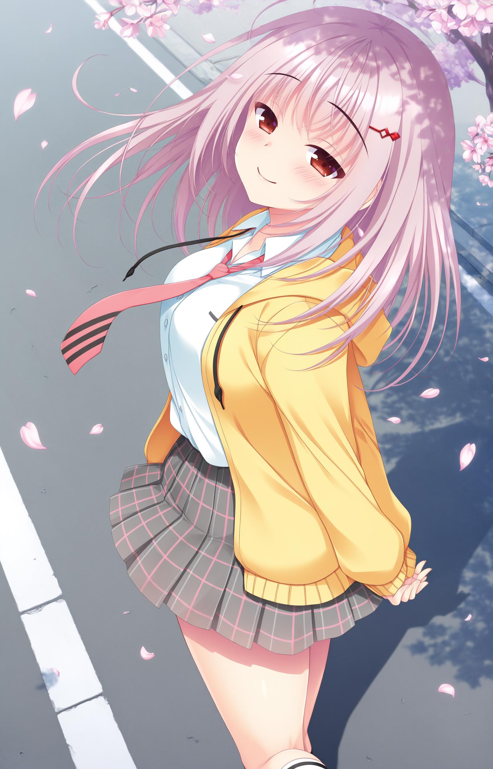 Yellow Jacket outfit: uniform adachii,long hair,skirt,necktie,diagonal-striped necktie,shoes,socks,shirt,white shirt,school uniform,pleated skirt,striped,white socks,collared shirt,plaid skirt,open clothes,long sleeves,jacket,open jacket,sleeves past wrists,red necktie,grey skirt,yellow jacket,