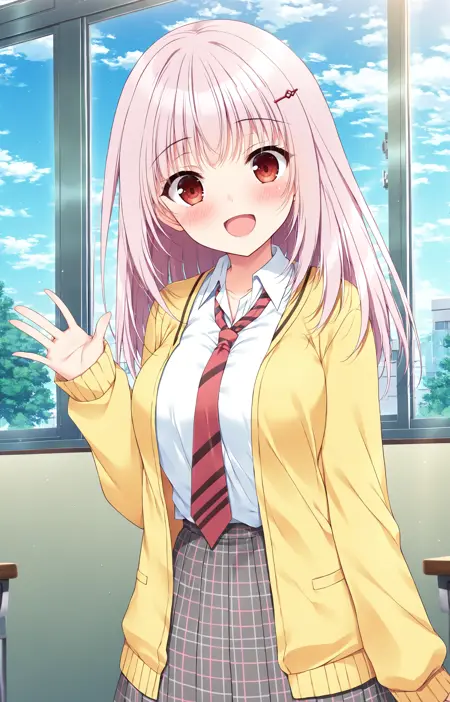 イエロージャケットの服装:ユニフォームAdachii、長い髪、スカート、ネクタイ、斜めストライプネクタイ、靴、靴下、シャツ、白いシャツ、学校制服、プリーツスカート、ストライプ、白い靴下、カラー付きシャツ、チェックスカート、オープンな服、長袖、ジャケット、オープンジャケット、袖が手首より長い、赤いネクタイ、灰色のスカート、黄色のジャケット