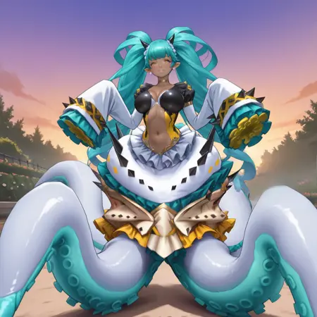 トリガー語: Scylla、モンスターガール、タコ娘、角、髪飾り、前髪、長い髪、異常に長い髪、ツインテール、ドリル髪、フリル、黄色い目、リップスティック、化粧、尖った耳、真珠のイヤリング、チョーカー、胸元、長袖、手首より長い袖、へそ、棘、触手、