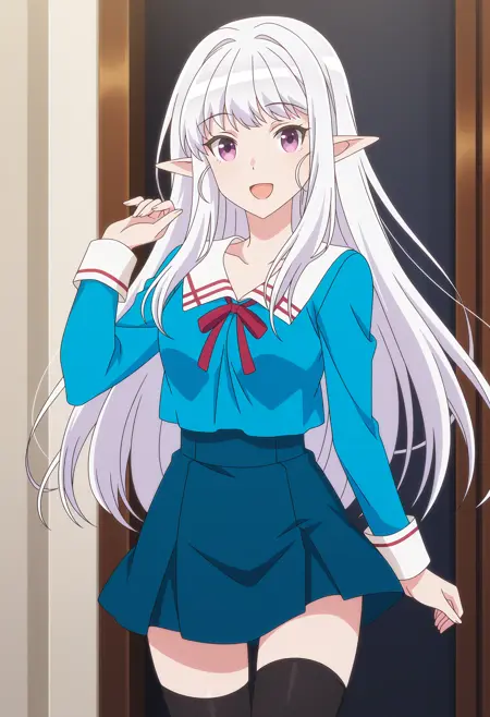 • blue shirt,school uniform,long sleeves,darkblue skirt,black thighhighs,