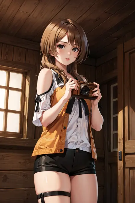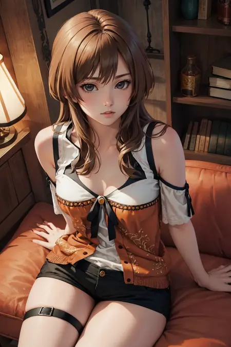 添加 "衬衫、短裤、大腿绑带" 以呈现她的典型造型。