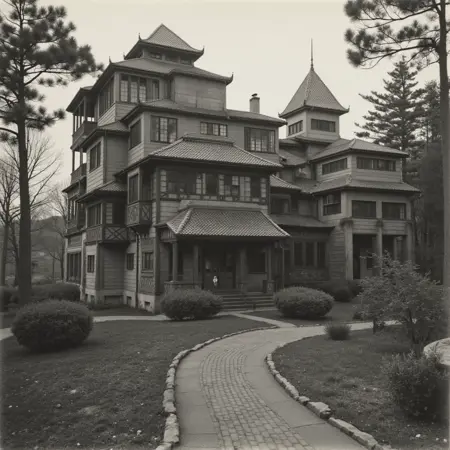 여기서 XX에는 건물 유형——예: '유령이 머무는 도서관'이나 '파괴된 수도원'——을 넣었고, YY에는 하루의 시간, 빛의 종류, 또는 다른 시각적 스타일 수정자——예: '황금 시간대에', '해질녘에' 등——를 넣었습니다.