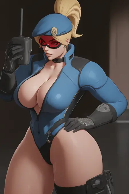 Trigger Leotard : femcp, long hair, ponytail, choker, hat, forehead mask, tinted eyewear, leotard, unzipped, cleavage, knee boots, thigh strap, gloves, highleg