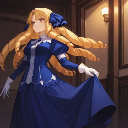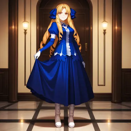 Luviagelita edelfelt, long hair, blonde hair, blue dress, drill hair, brown eyes, hair ribbon, white gloves, white boots,