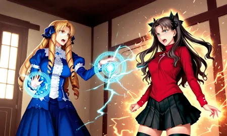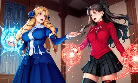 multiple girls, ,rin_tohsaka, 2girl, big breasts, two girls one girl with (long black hair and blue eyes hair ribbon) second girl is luviagelita edelfelt girl with (long hair blonde hair drill hair brown eyes hair ribbon),