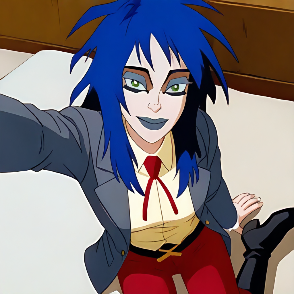 カレッジ衣装: kyl, 1girl, 青く乱れた髪, 緑の目, メイク, 灰色の口紅, 透き通った肌, 黄色のシャツ, 赤いネクタイ, 灰色のジャケット, 赤のズボン, 黒のブーツ, カートゥーン