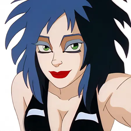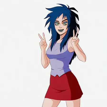 カジュアル衣装№1: kyl, 1girl, 青く乱れた髪, 緑の目, メイク, 灰色の口紅, 透き通った肌, 紫のタンクトップ, 赤のスカート, 黒のブーツ, カートゥーン