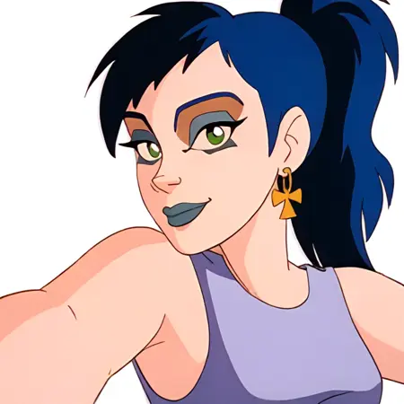 一般市民衣装: kyl, 1girl, 青い髪のポニーテール, 緑の目, メイク, 灰色の口紅, 透き通った肌, プリントシャツ, ピンクのシャツ, 紫のビーサンキャップ, 金のイヤリング, カートゥーン