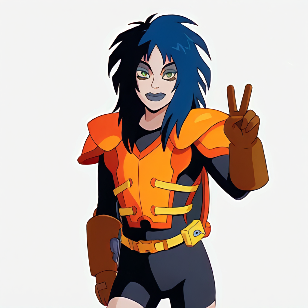 ゴーストアーマー: kyl, 1girl, 青く乱れた髪, 緑の目, メイク, 灰色の口紅, 透き通った肌, ゴーストオレンジのアーマー, 黒のヨガショーツ, 茶色の手袋, 茶色の肘当て, 黒のブーツ, カートゥーン