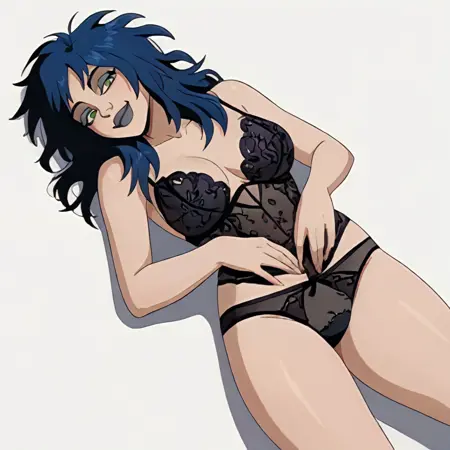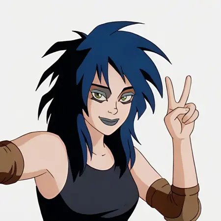 カジュアル衣装№2: kyl, 1girl, 青く乱れた髪, 緑の目, メイク, 灰色の口紅, 透き通った肌, 灰色のタンクトップ, 茶色の肘当て, カートゥーン