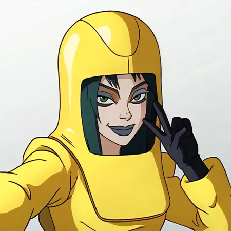ハザードスーツ: kyl, 1girl, 緑の目, メイク, 灰色の口紅, 透き通った肌, ハザード帽子, 黄色のハザードスーツ, 黒の手袋, ヘッドフォン, カートゥーン