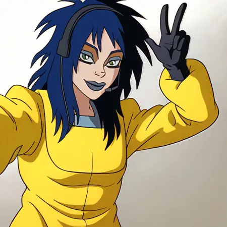 帽子なし: kyl, 1girl, 青く乱れた髪, 緑の目, メイク, 灰色の口紅, 透き通った肌, 黄色のハザードスーツ, 黒の手袋, ヘッドフォン, カートゥーン