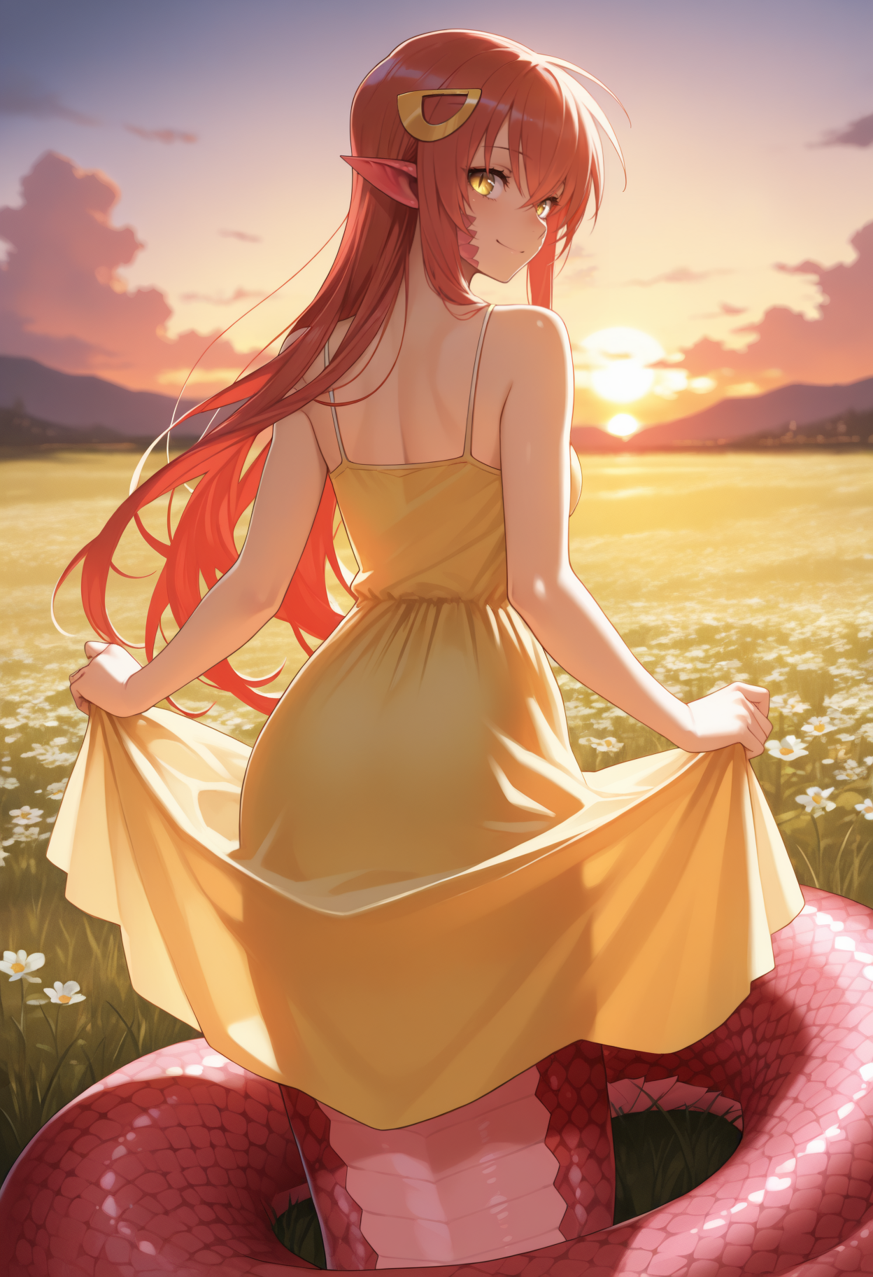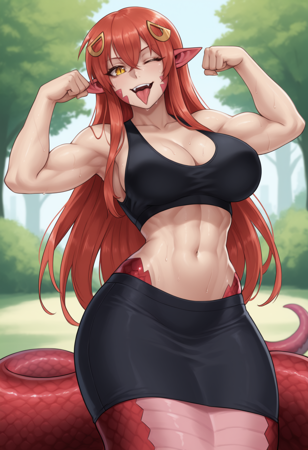 트리거 + 외모: m11a, monster girl, lamia, scales, red hair, hair between eyes, hairclip, pointy ears, yellow eyes, slit pupils, large breasts