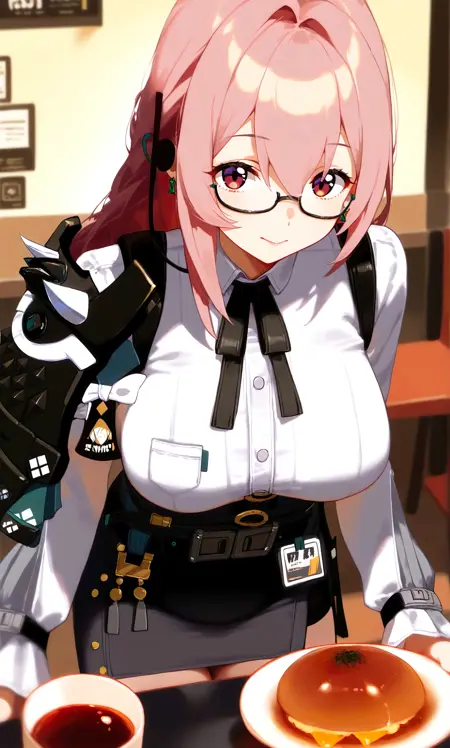 검은 장갑, 벨트, 목 리본, 허리 높은 치마, 펜실 치마, 검은 미니 치마, 검은 리본, 흰색 셔츠, 칼라 셔츠, 어깨 갑옷, 긴 소매, 검은 신발, 하이힐