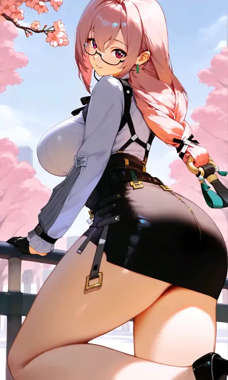 tsukishiro yanagi (zenless zone zero), 보라색 눈, 눈밑 안경, 검은 프레임 안경, 분홍색 머리, 중간 길이 머리, 옆머리, 반지 장식, 머리 장식, 땋은 머리