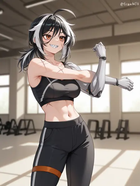 orca, 1girl, solo, 黒髪, 赤い目, 胸元, ポニーテール, ahoge, 白髪, ブーツ, 歯, にやりと笑う, 斑入り髪, 傷, 尖った歯, 顔の傷, 茶色の手袋, 機械腕、単一の機械腕