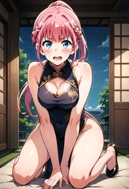 1소녀, 혼자, 미하루 키리스, Bokutachi wa Benkyou ga Dekinai, 분홍색 머리, 긴 머리, 꼬임, 앞머리, 파란 눈, 땋은 머리, ((프렌치 땋기)), 윤기 나는 머리, (중간 크기의 가슴), 머리카락에서 보이는 눈썹