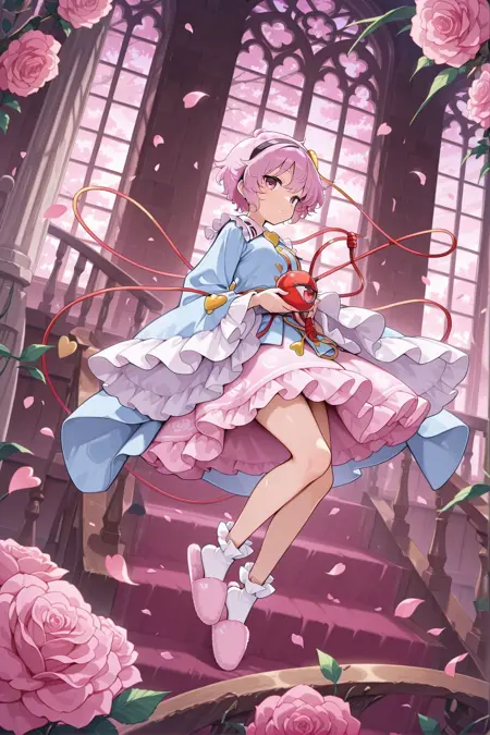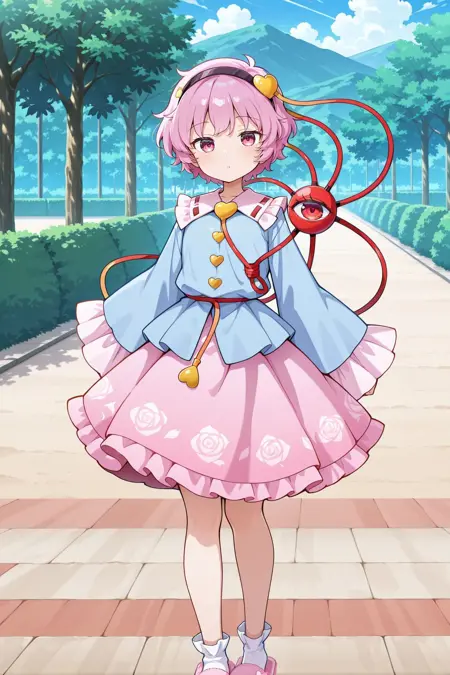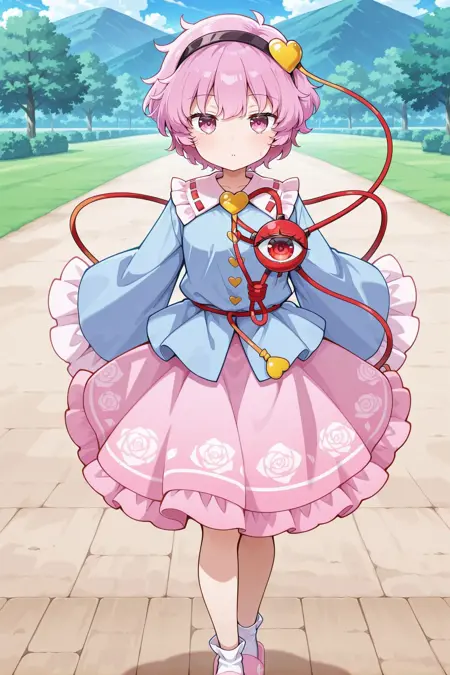 komeiji satori, 1girl, solo, pink eyes, pink hair, short hair, third eye, komeiji satori \(tiny underworld queen\), aged down, black hairband, blue shirt, heart hair ornament, yellow heat, frilled shirt, long sleeves, wide sleeves, yellow buttons, heart button, pink skirt, frilled skirt, pink slippers, white socks,