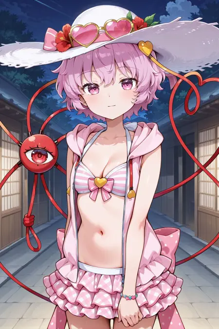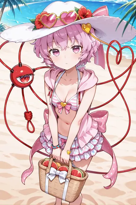 komeiji satori, 1girl, solo, pink eyes, pink hair, short hair, third eye, komeiji satori \(the girl even the beachgoers fear\), alternate costume, heart of string, straw hat, white hat, hat flower, hat bow, heart-shaped eyewear, pink-tinted eyewear, yellow-framed eyewear, eyewear on headwear, hood, pink vest, open vest, swimsuit, white bikini, striped bikini, bow bikini, navel, cleavage, frilled skirt, plaid skirt, back bow, pink bow, polka dot, bracelet, jewelry, sandals, holding basket,