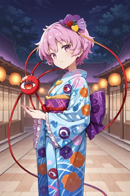 komeiji satori, 1girl, solo, pink eyes, pink hair, short hair, third eye, komeiji satori \(travel safety satori youkai\), alternate costume, mini hat, purple hat, hat flower, heart hat ornament, multicolored kimono, blue kimono, floral print kimono, eyeball print, wide sleeves, lace-trimmed sleeves, furisode, back bow, purple bow, holding arrow,