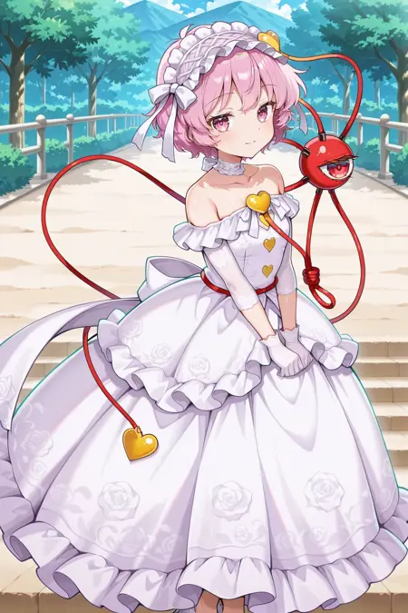 komeiji satori, 1girl, solo, pink eyes, pink hair, short hair, third eye, komeiji satori \(blank white map of the underworld\), alternate costume, frilled hairband, white hairband, heart hair ornament, crystal hair ornament, white choker, off shoulder, bare shoulders, wedding dress, strapless dress, long dress, yellow buttons, heart button, white gloves, white shoes, high heels,