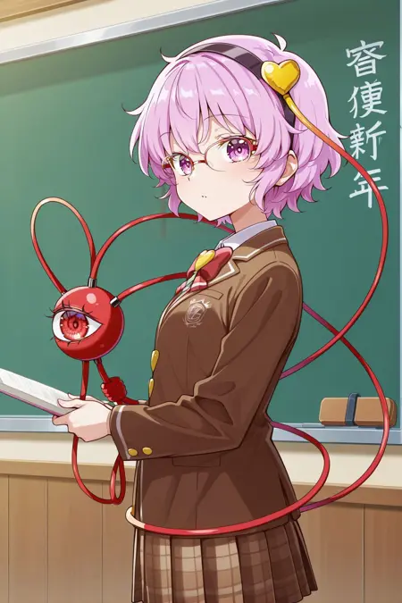 komeiji satori, 1girl, solo, pink eyes, pink hair, short hair, third eye, komeiji satori \(smart earth spirit student president\), alternate costume, 眼镜,粉色眼镜,黑色发带,心形发饰,棕色夹克,西装外套,长袖,校服,有领衬衫,白色衬衫,红色领结,棕色裙子,格子裙,百褶裙,超短裙,及膝袜,白色袜子,粉红鞋子,