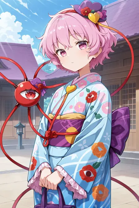 komeiji satori, 1girl, solo, pink eyes, pink hair, short hair, third eye, komeiji satori \(travel safety satori youkai\), alternate costume, 小帽子,紫色帽子,帽饰花,心形帽饰,多彩和服,蓝色和服,花卉印花和服,眼球印花,宽袖,蕾丝边袖子,振袖,背部蝴蝶结,紫色蝴蝶结,手持箭矢,