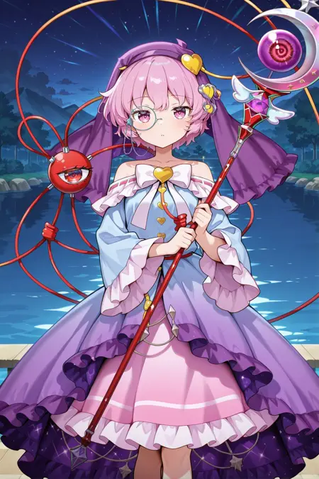 komeiji satori, 1girl, solo, pink eyes, pink hair, short hair, sidelocks, third eye,, komeiji satori \(astrological magical girl\), alternate costume, 心形发饰,双层薄纱,紫色薄纱,单片眼镜,眼镜链,白色领结,露肩,无肩带设计,分层连衣裙,蓝色连衣裙,荷叶边连衣裙,渐变色连衣裙,星空印花,长袖,荷叶边袖子,宽袖,粉红裙子,紫色拖鞋,手持法杖,