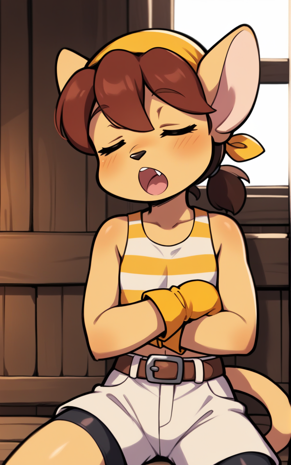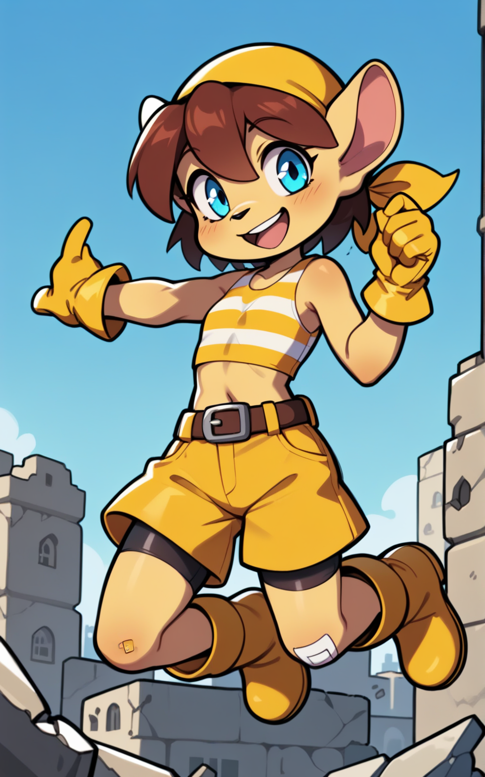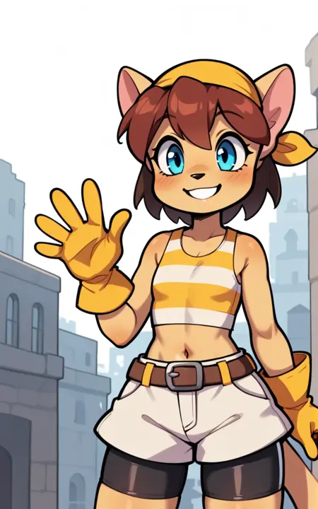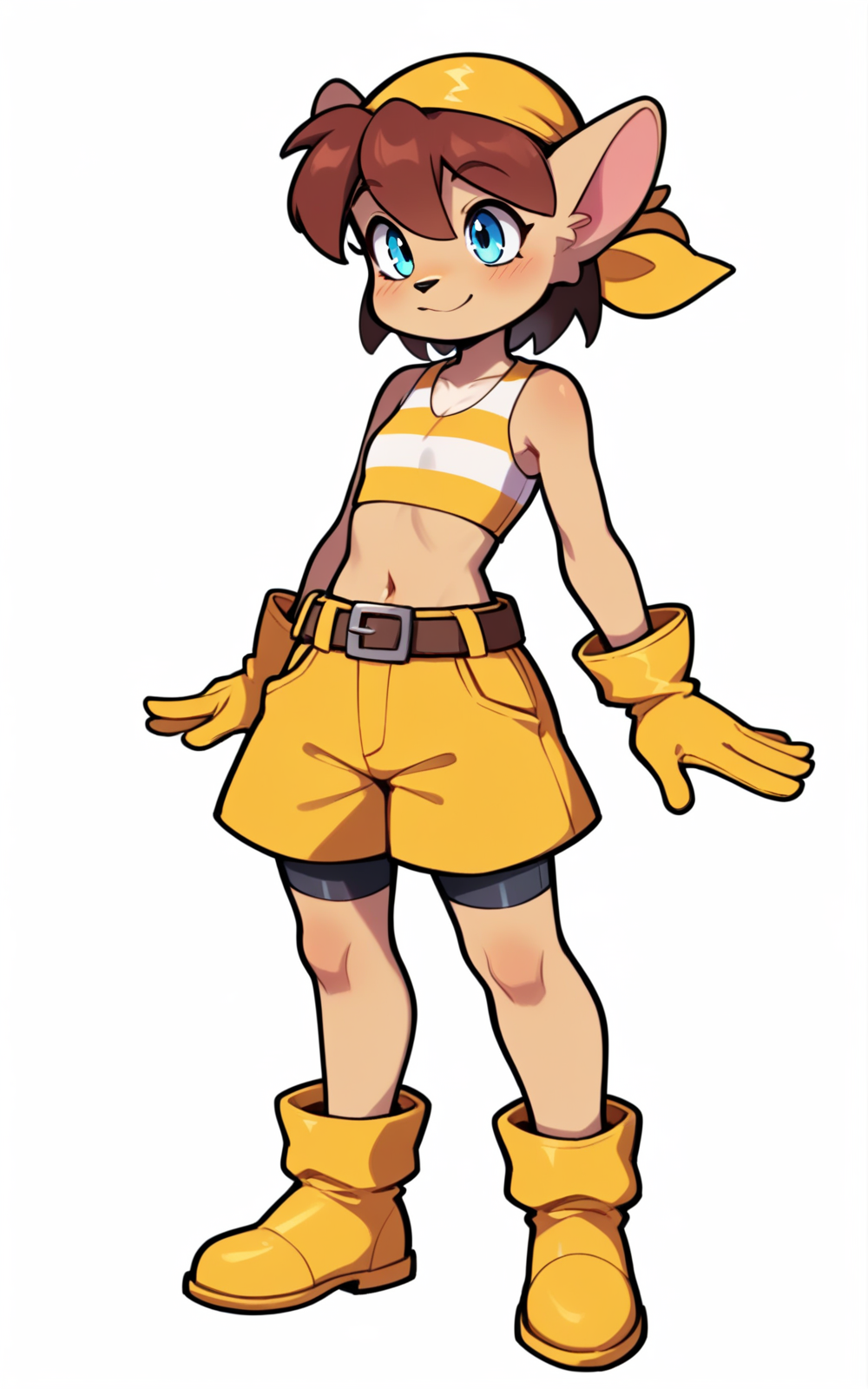 衣装:縞模様のクロップトップ、黄色のクロップトップ、クロップトップ、ノースリーブ、ショートパンツの下に自転車用ショートパンツ、バンダナ、黄色のバンダナ、手袋、ショートパンツ、黄色のショートパンツまたは白いショートパンツ、ベルト、ブーツ、お腹の部分、黄色の履物、黄色の手袋**