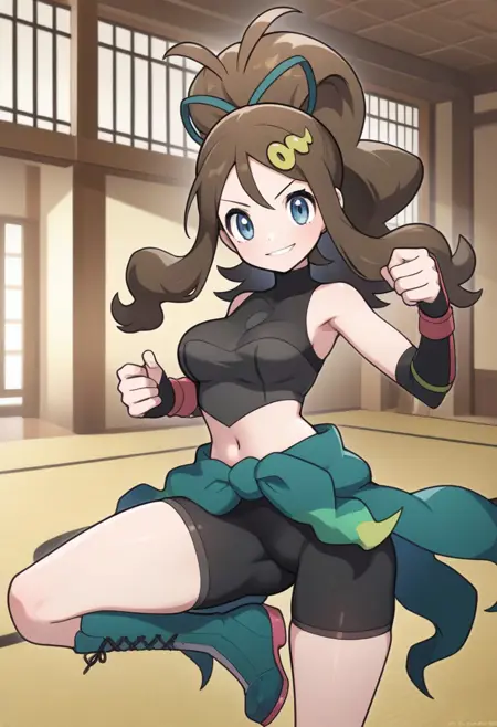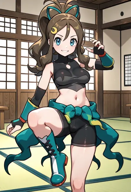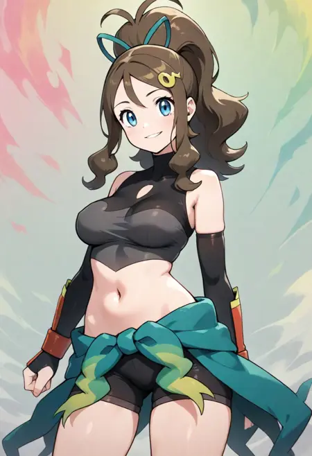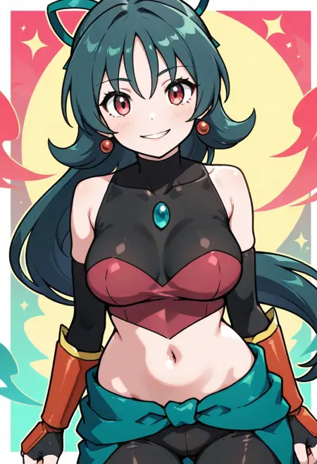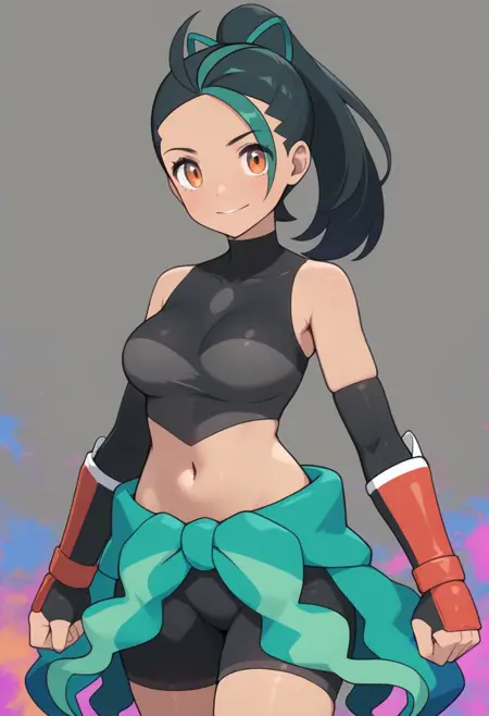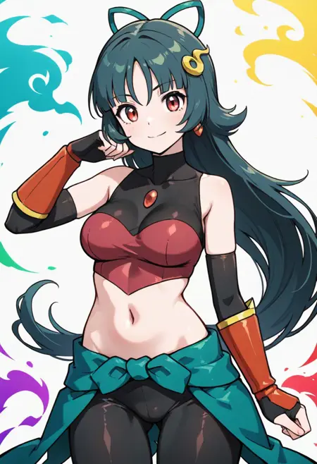发饰、发带、绿色发带、无袖衬衫、黑色衬衫、高领衫、露肩、腹部、肚脐、肘部手套、露指手套、黑色短裤、腰间外套、绿色外套、及膝靴、多彩鞋履、绿色鞋履、白色鞋履