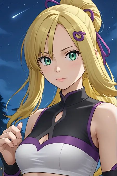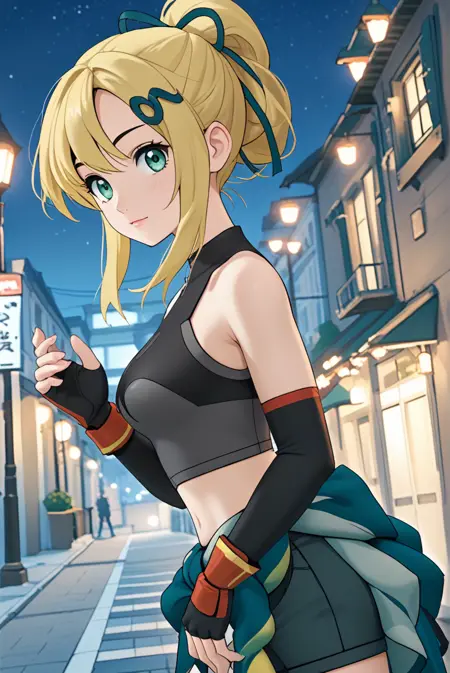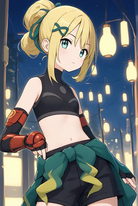 ヘアオーナメント、ヘアリボン、緑のリボン、無袖シャツ、黒シャツ、タートルネック、裸の肩、お腹、へそ、肘 Gloves、フィンガーレス Gloves、黒ショートパンツ、ウエストに巻きつけたジャケット、緑のジャケット、膝上ブーツ、マルチカラーの靴、緑の靴、白い靴