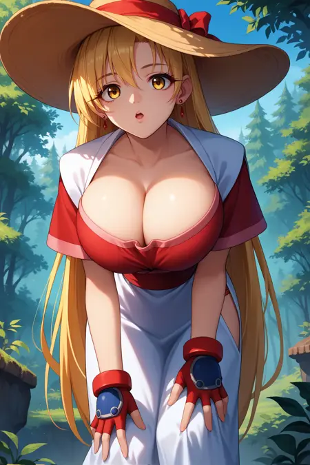 要呈现她的典型造型,请添加 "帽子、耳环、白色连衣裙、露胸、红色上衣、红色腰带、短袖、红色手套、露指手套、侧开衩、腰带"。