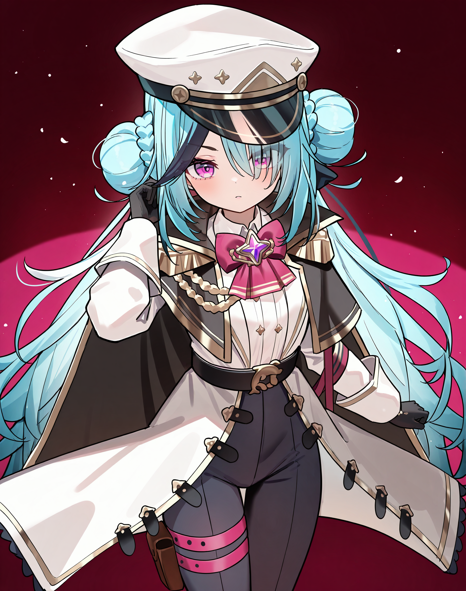zenyahima, hat, cape, jacket, sharp teeth, bare shoulders, shorts, double bun,