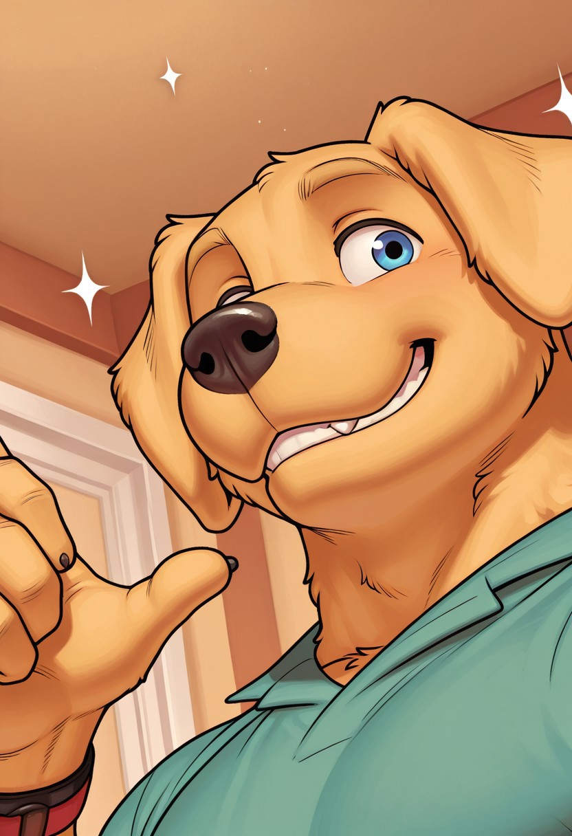 强化提示词:“金毛寻回犬,毛茸茸,尾巴,蓝眼睛,健壮,有肌肉的男性,运动型身材,宽大的胸肌”