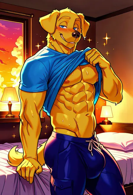 Reinforcement Prompts: "golden retriever, furry, tail, blue eyes, muscular, toned male, athletic build, large pectorals"