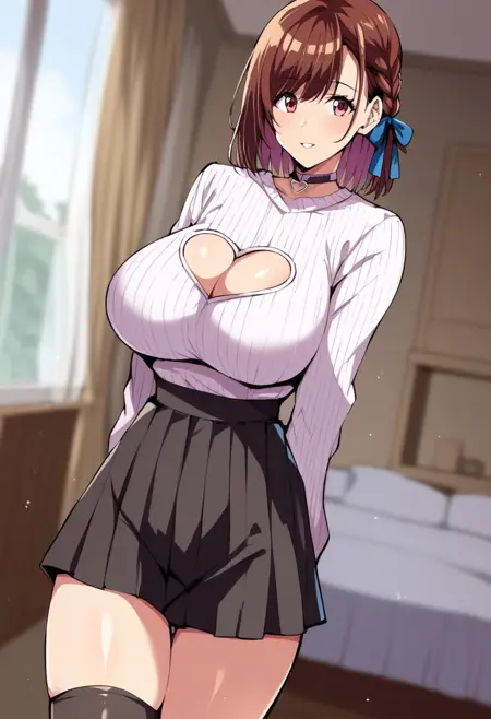 胸元の露出、衣装の切り抜き、胸元の切り抜き、ハートの切り抜き、セーター、ハートのチョーカー、ブラックチョーカー、スカート、絶対領域、ブラックのレッグウォーマー、赤い靴