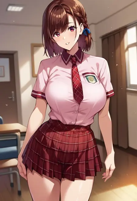 キャラクタープロンプト(桜間小咲): 1girl, kosaki sakurama, solo, purple eyes, medium hair, brown hair, bangs, braid, hair ribbon, large breasts