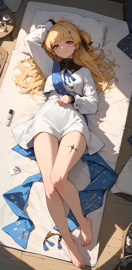 phoebe, 흰 모자, 검은 장갑, 다리 문신, 흰 팬티스타킹, 흰 부츠