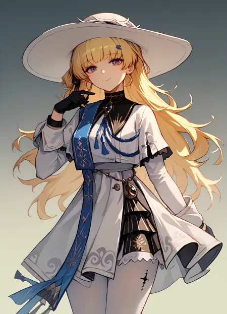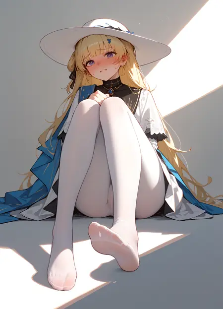 phoebe, white hat, black gloves, leg tattoo, white pantyhose, white boots