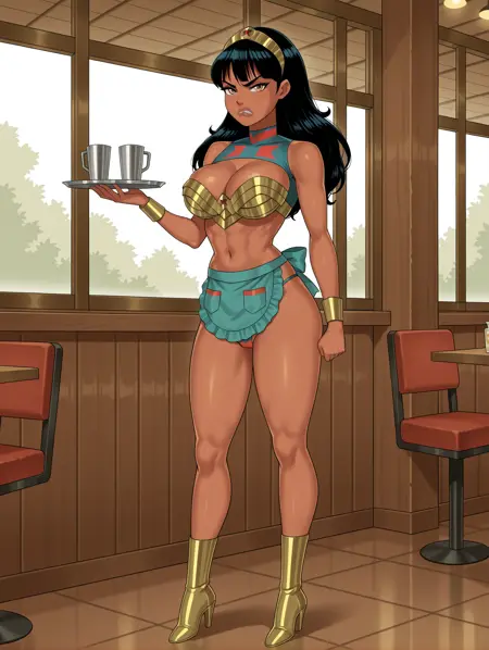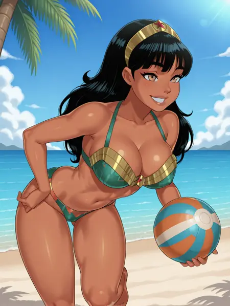 Yara Flor, 1girl, tiara, black hair, brown eyes, dark-skinned female, lips, long hair