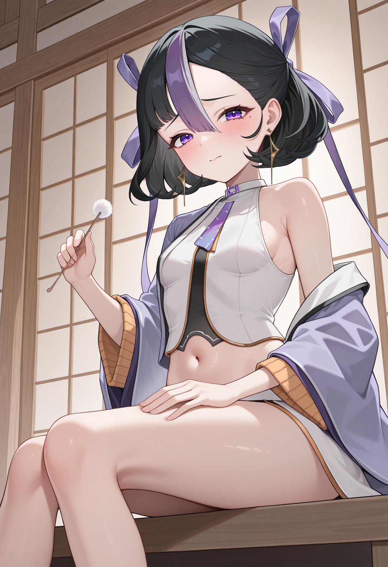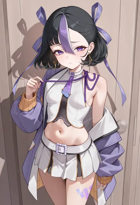 syuen, 보라색 눈, 눈 아래 점, 검은 머리, 다색 머리, 줄무늬 머리, 보라색 머리, 단발, 눈 사이 머리, 보라색 리본, 머리 리본, 삼각형 귀걸이, 작은 가슴, 보라색 로프, 보라색 넥타이, 짧은 넥타이, 흰색 셔츠, 어깨 노출, 크롭탑, 배꼽, 보라색 재킷, 어깨 드러냄, 흰색 벨트, 흰색 치마, 미니 치마, 주름 치마, 다리 문신