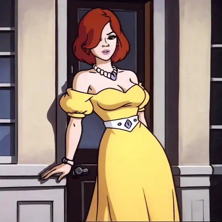 带黄色连衣裙触发词:AprilONeilYellowDress, 1girl, 珍珠项链, 珠宝, 露肩连衣裙, 红发, 露肩, 中等胸部, 深邃乳沟, 短发, 黄色连衣裙, 腰带, 头发遮住一只眼睛, 黑色眼睛, 裸露肩膀, 短袖, 口红, 妆容, 蓬松袖子, 牛仔镜头
