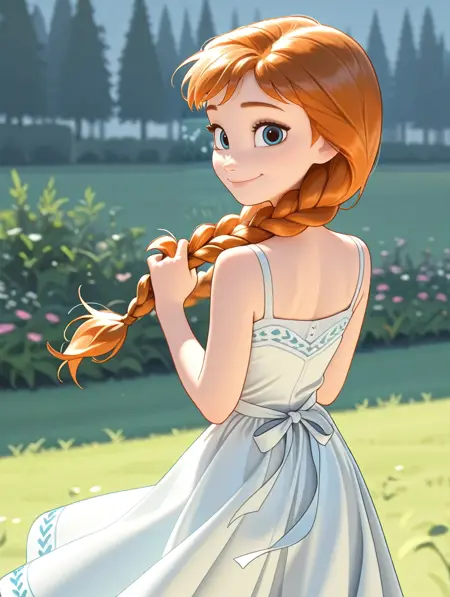 DisneyAnna, 1girl, orange hair, blue eyes, twin braids