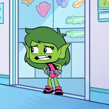 black and purple sleeveless dress, gray belt, gray gloves, black and perple shoes