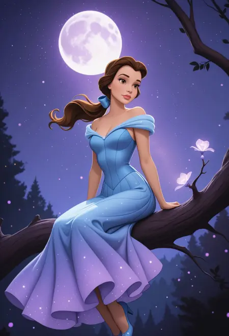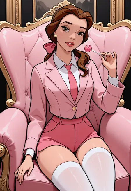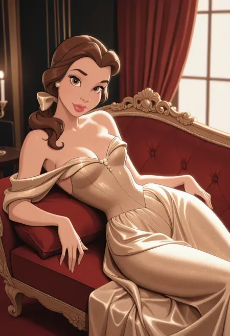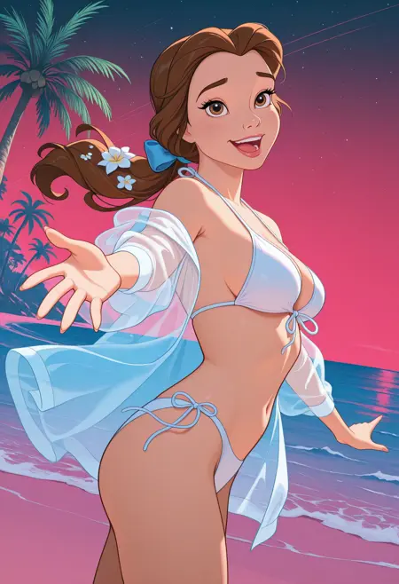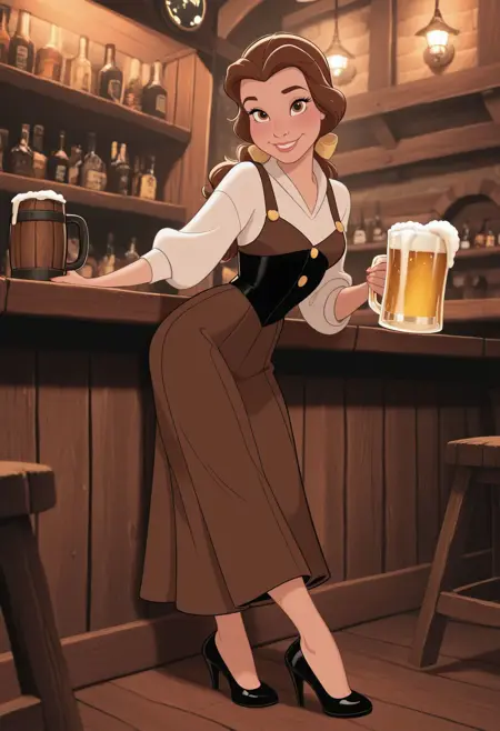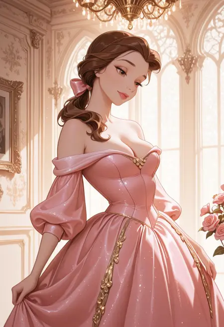 DisneyBelle, 1girl, brown hair, brown eyes, long hair, low ponytail, hair bow